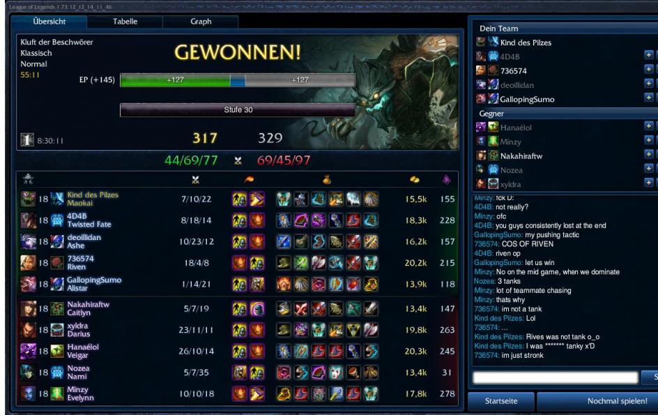 Alle wollte schon aufgeben nur Riven und ich net °-° und siehe da, wir hams doch noch hin bekommen =DHach, da will man nur noch eine Runde ARAM machen bevor man zu Bett geht und bekommt 'n geiles Spiel. :)