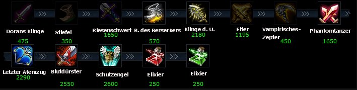 Empfehle dir diese Itemreihenfolge: Boots,3x HP Pots - 1. Back Dorans Klinge und/oder Vampirisches Zepter - 2. Back Übergroßes Schwert und Beinschienen des Berserkers. Dann baust du aus deinem Übergroßen Schwert Klinge der Unendlichkeit.