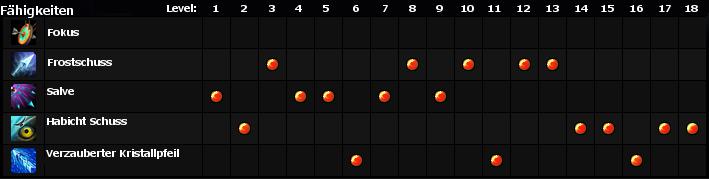 Mehrere Pfeile werden fächerförmig abgefeuert, die jedem getroffenen Gegner starke Verletzungen zuführen. Außerdem wirkt zusätzlich der Effekt des Frostschusses auf jeden dieser Pfeile, wodurch der Angriff noch wirkungsvoller wird.