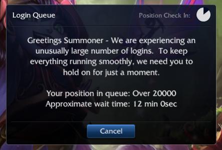 Muss noch ~9 Minuten warten o.OBin schon drinnen, aber Rankeds deaktiviert :/Ich musste schonmal 1 1/2 Std. ++ in der Warteschlange alleine zum einloggen warten, hab's dann einfach sein lassen :PBla bin auch drinne (: