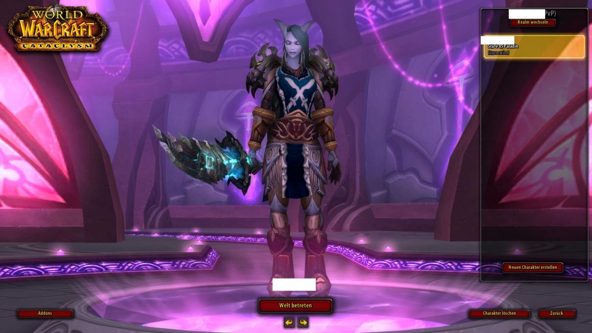 Mein Main ist eine weibliche Draenei Vergelter Paladin auf einem PvP Server mit einem PvP Gearscore von 393.