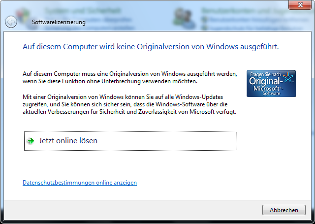 Allerdings scheine ich entweder etwas überlesen oder falsch gemacht zu haben. Die Benachrichtigung unten in der Ecke, daß die Echtheit noch nicht bestätigt wurde ist nach wie vor vorhanden und alle Nase lang - vor allem beim Aufrufen von z.B. der Systemsteuerung - kommt: