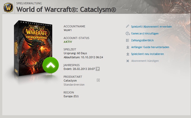 Der Account verfügt noch bis zum 10.10.12 über Spielzeit, hat jedoch noch ein Jahrespass-Abo bis zum 28.2.13, das nicht bezahlt ist. (Gegen Aufpreis lade ich das Konto auf, damit der Jahrespass gedeckt ist.)