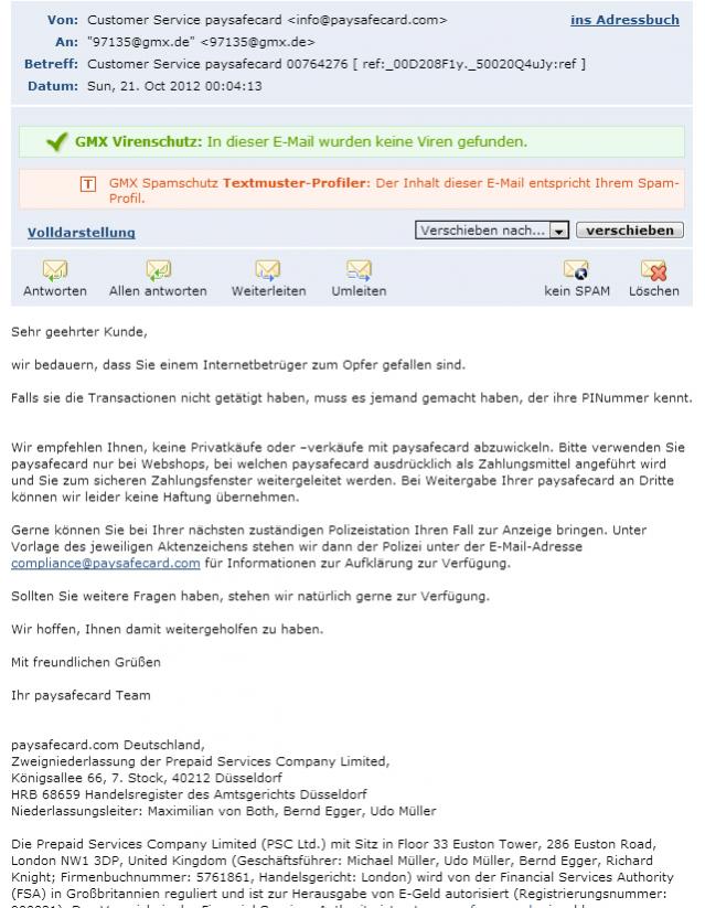 2) Als ich das gesehen habe, habe ich den PSC Kundendienst kontaktiert und diese Mail erhalten.