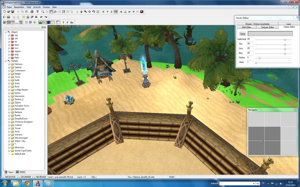 • Beach ist leider immer ein ungutes Thema für Flyff. Gibt wenig Strand-Models, bis auf Koralleninsel, aber machbar natürlich immer. Dann kann man halt nicht so viel Abwechslung reinbringen.. Schau dir mal die Koralleninsel an, vielleicht bekommst du da ja noch ein paar Anregungen. Ansonsten kann ich dir immer den Tipp geben mit dem Farbeneditor nen bisschen rumzuspielen. Ist das Logo neben der Textur. Da kannst du vieles sehr abwechslungsreich darstellen. Oder verschiedene Sandtexturen überlagern. Dazu den Radius hochstellen(z.b. 5) aber die härte auf 1 nur. Und dann leicht versetzt eine andere Strandtextur. Dann überlagern die sich so nen bisschen. Viel Glück!