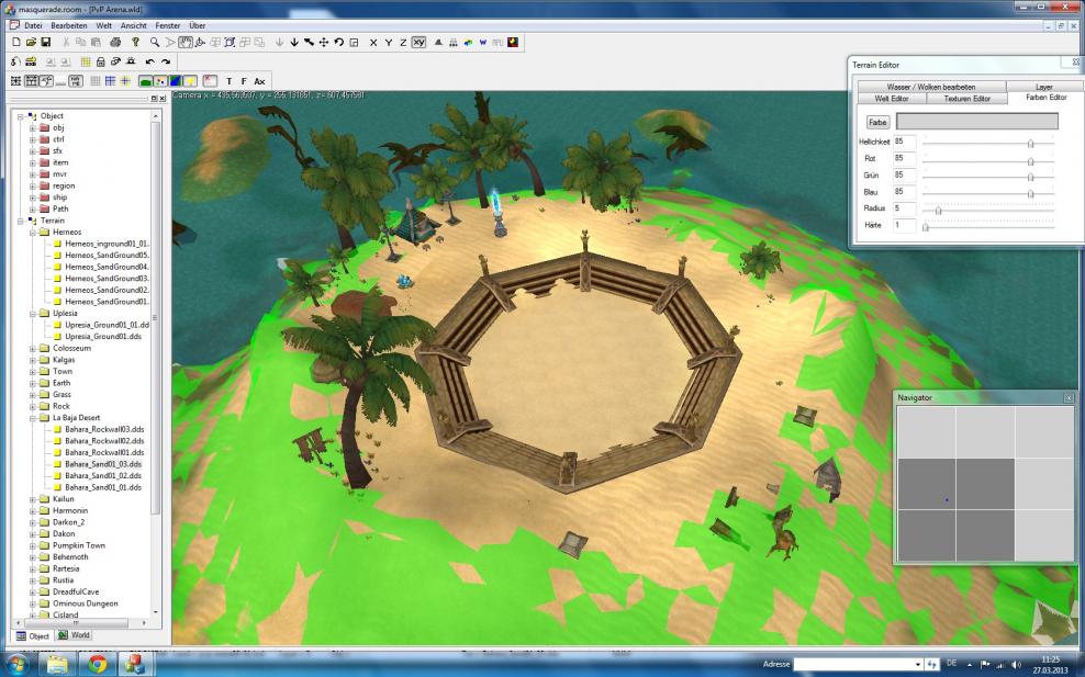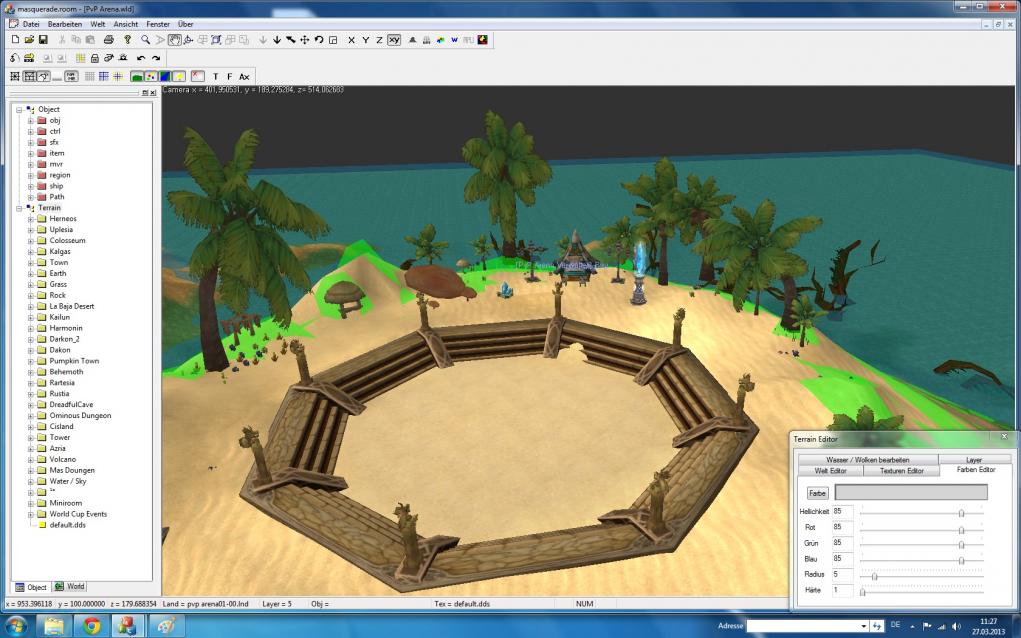 • Beach ist leider immer ein ungutes Thema für Flyff. Gibt wenig Strand-Models, bis auf Koralleninsel, aber machbar natürlich immer. Dann kann man halt nicht so viel Abwechslung reinbringen.. Schau dir mal die Koralleninsel an, vielleicht bekommst du da ja noch ein paar Anregungen. Ansonsten kann ich dir immer den Tipp geben mit dem Farbeneditor nen bisschen rumzuspielen. Ist das Logo neben der Textur. Da kannst du vieles sehr abwechslungsreich darstellen. Oder verschiedene Sandtexturen überlagern. Dazu den Radius hochstellen(z.b. 5) aber die härte auf 1 nur. Und dann leicht versetzt eine andere Strandtextur. Dann überlagern die sich so nen bisschen. Viel Glück!