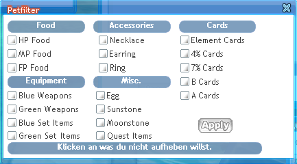 Hier findest du folgendes: Tickets,Inventory Bags, Cloaks, Cs Pets sowie ein Egg.
