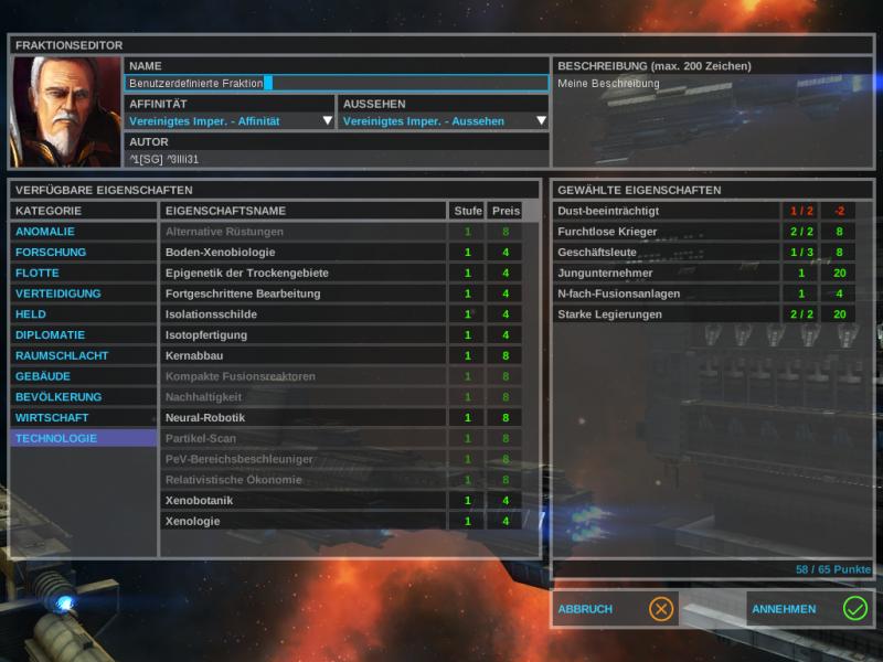 zum anderen kann man sich aber auch sehr einfach und auch sehr sehr Einsteiger freundlich ein komplett eigenes Volk, mit eigener Story etc "Basteln" und dieses Spielen. Man kann dem Volk frei die Vor und Nachteile geben, die man möchte.